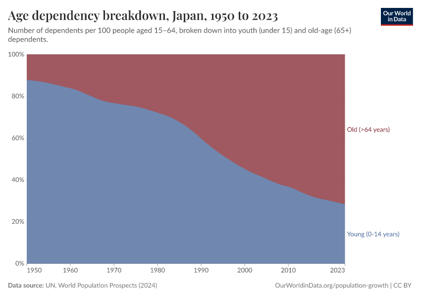 As we see, Japan has a much older population: in 2021, there were more than twice as many above 64 as there were children younger than 15. This has not always been the case, as the chart shows. Japan has aged significantly in recent decades: in 1950, there were over 7 children younger than 15 for every person above 64.