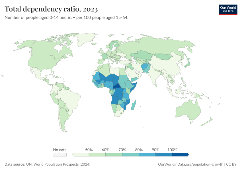But we see big differences across the world. The ratio is much higher across many countries in Sub-Saharan Africa: several countries have a dependent population around the same size or larger than their working-age populations.