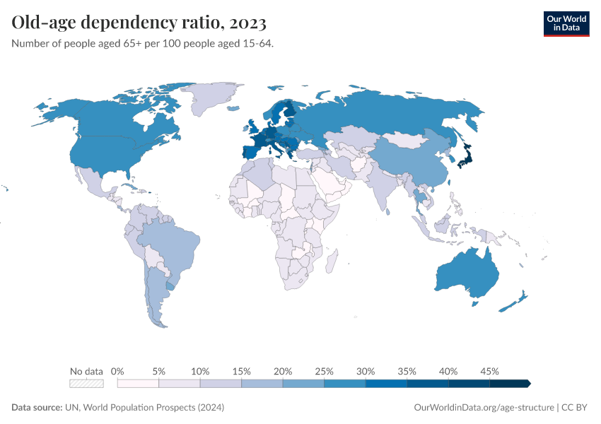 The old-age dependency ratio is almost a mirror image. Higher-income countries — particularly across Europe, North America, and East Asia — have the highest dependency ratios.