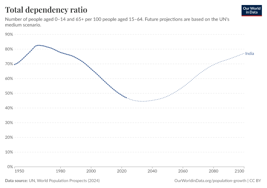 India, one of the most populous countries, which has seen a rapid decline in fertility rates in recent decades, has had a large potential demographic dividend. The age dependency ratio in India in 1970 was almost 80%, because of a very young demographic. Since then it has fallen to below 50%, and is expected to fall until the mid-2030s.