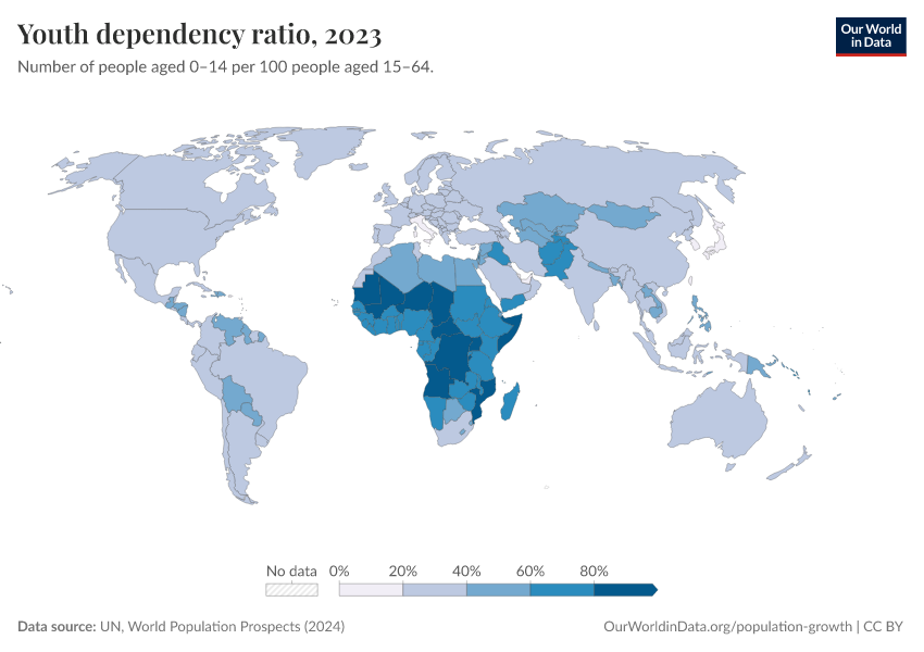 The young dependency ratio is high across Sub-Saharan Africa in particular. Some countries in this region have close to the same number of young people as they have working-age population. The youth dependency ratio is much lower across higher-income countries since fertility rates tend to be much lower there.