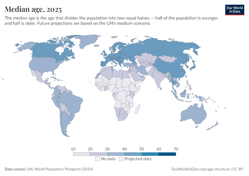 Lower-income countries tend to have a lower median age. This is because they have a younger and faster growing population overall.
