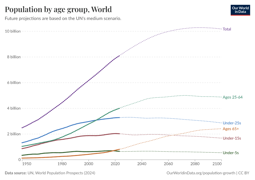 We can see this transition clearly when we look at the population by age bracket in the chart — this is shown from 1950 onwards, with UN projections to 2100.