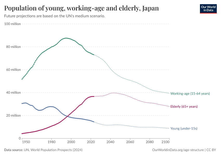 In Japan and other high-income countries, it's expected that the older demographic over 65 years old will continue to increase in the coming decades. Since the youth share is not expected to change significantly, this means the share of the population who is working age is expected to fall further.