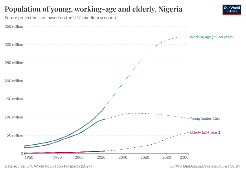 Nigeria currently has a much younger population. However these children and adolescents will move into the working-age bracket soon, and the share of the productive working-age population will increase significantly in the coming decades.