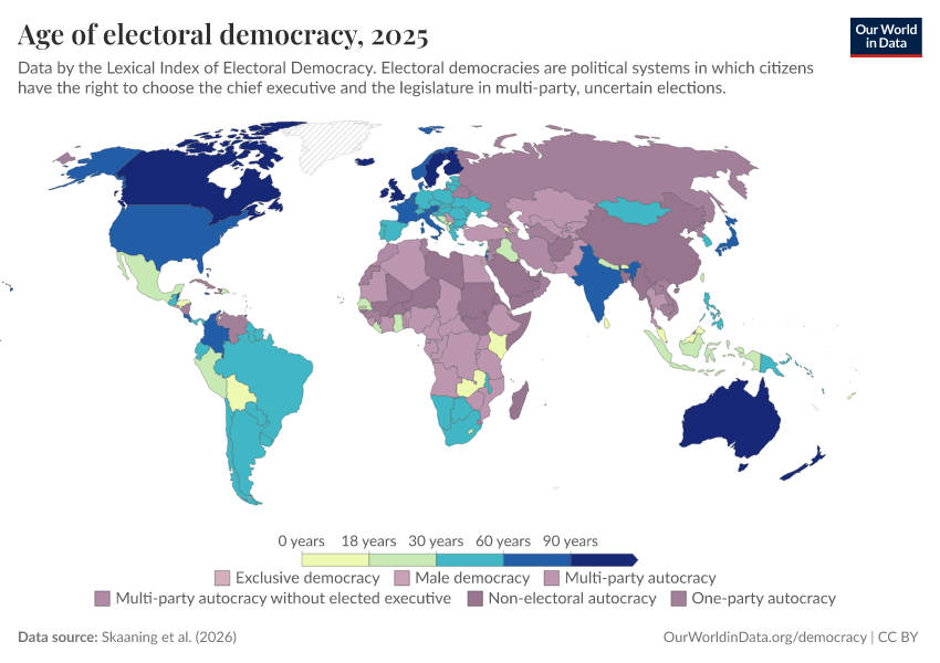 Bastian Herre (2022) - “In most countries, democracy is a recent achievement. Dictatorship is far from a distant memory.” Published online at OurWorldinData.org. Retrieved from: 'https://who-mortality-db.owid.pages.dev:8789/20260304-094028/democracies-age.html' [Online Resource] (archived on March 4, 2026).BibTeX citation