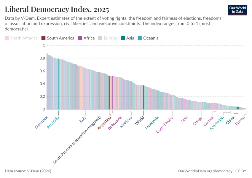 Other countries, concentrated in Asia, are highly undemocratic according to V-Dem. This includes countries such as China, North Korea, the United Arab Emirates, and the least democratic country in the world, Saudi Arabia, with a score of just 0.01. In these countries, citizens do not have the right to choose their political leaders in popular elections.