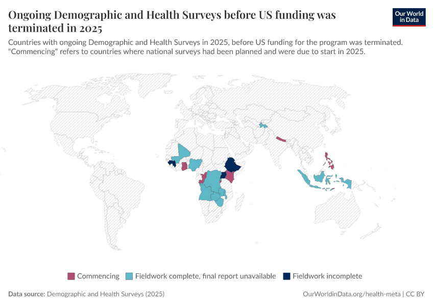 It was primarily funded by the United States Agency for International Development (USAID) and run by the American company ICF International. But earlier this year, the US government announced that it had terminated funding for the program. This threatens global health and development efforts and will affect many of the estimates we provide on Our World in Data.