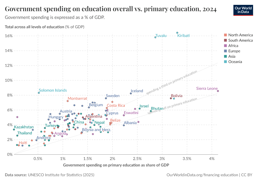 This can be appreciated in the following visualization, where the prioritization of primary education (i.e. the share of primary education within the education budget) is plotted against the overall prioritization of education (i.e. the share of education within the entire government budget).