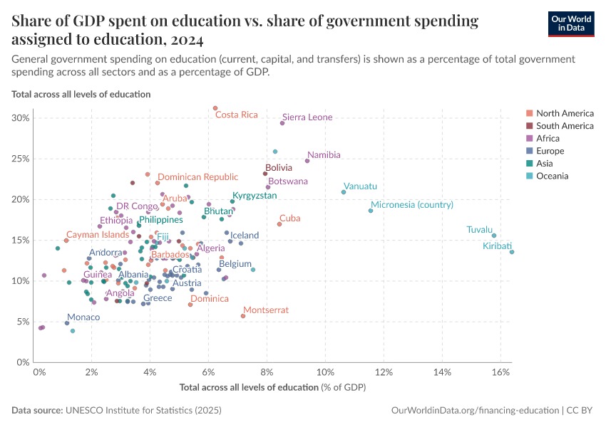 Generally speaking, countries that spend a large share of their income on education also tend to prioritize education highly within their budgets.