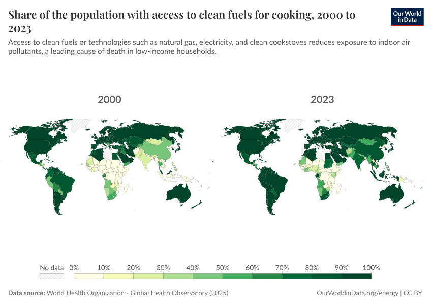 World Health Organization - Global Health Observatory (2025) – processed by Our World in Data. “Share of the population with access to clean fuels for cooking” [dataset]. World Health Organization, “Global Health Observatory” [original data]. Retrieved March 12, 2026 from https://who-mortality-db.owid.pages.dev:8789/20260304-094028/grapher/access-to-clean-fuels-and-technologies-for-cooking.html (archived on March 4, 2026).