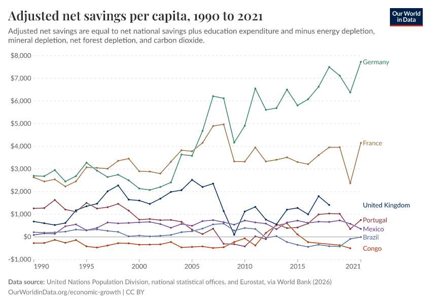 “Data Page: Adjusted net savings per capita”. Our World in Data (2026). Data adapted from United Nations Population Division, national statistical offices, and Eurostat, via World Bank. Retrieved from https://who-mortality-db.owid.pages.dev:8789/20260304-094028/grapher/adjusted-net-savings-per-person.html [online resource] (archived on March 4, 2026).How to cite this data