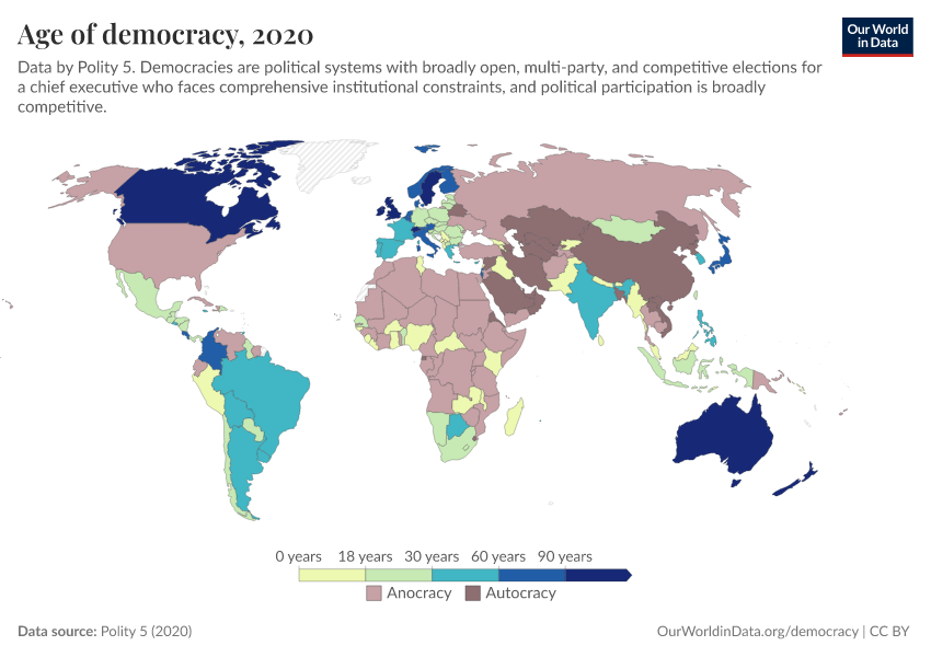 Polity 5 (2020) – processed by Our World in Data. “Age of democracy” [dataset]. Polity 5, “Polity5 Project, Political Regime Characteristics and Transitions, 1800-2018 5” [original data]. Retrieved March 12, 2026 from https://who-mortality-db.owid.pages.dev:8789/20260304-094028/grapher/age-of-democracy-polity.html (archived on March 4, 2026).