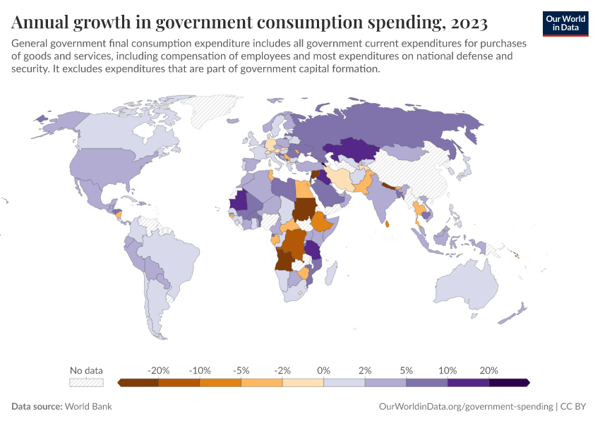 “Data Page: Annual growth in government consumption spending”. Our World in Data (2026). Data adapted from World Bank. Retrieved from https://who-mortality-db.owid.pages.dev:8789/20260304-094028/grapher/annual-growth-of-general-government-final-consumption-expenditure.html [online resource] (archived on March 4, 2026).How to cite this data