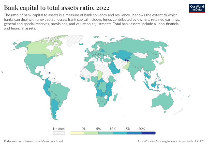 International Monetary Fund – processed by Our World in Data. “Bank capital to total assets ratio” [dataset]. International Monetary Fund, “International Monetary Fund, Financial Soundness Indicators.” [original data]. Retrieved March 12, 2026 from https://who-mortality-db.owid.pages.dev:8789/20260304-094028/grapher/bank-capital-to-total-assets-ratio.html (archived on March 4, 2026).