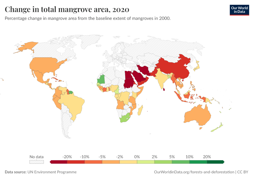 “Data Page: Change in total mangrove area”. Our World in Data (2026). Data adapted from UN Environment Programme. Retrieved from https://who-mortality-db.owid.pages.dev:8789/20260304-094028/grapher/change-in-total-mangrove-area.html [online resource] (archived on March 4, 2026).How to cite this data