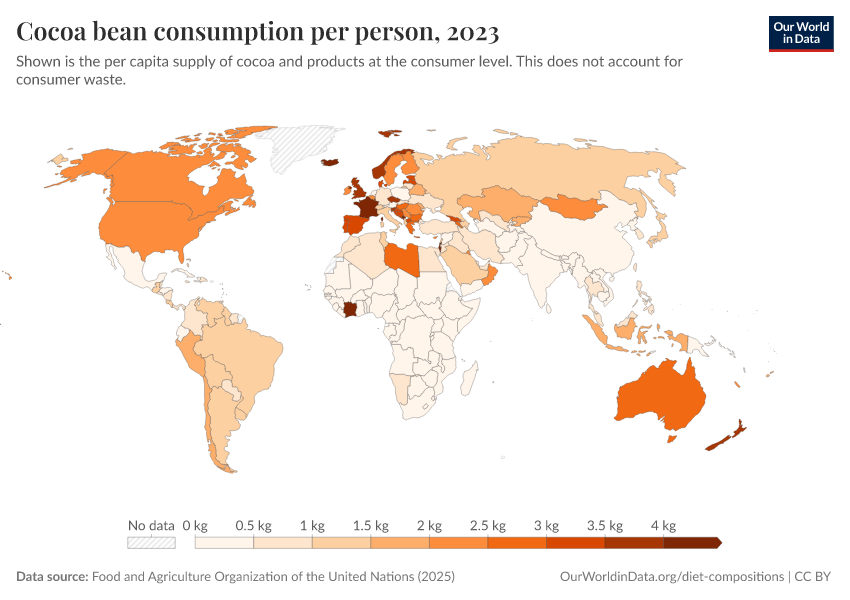 “Data Page: Yearly per capita supply of cocoa beans”. Our World in Data (2026). Data adapted from Food and Agriculture Organization of the United Nations. Retrieved from https://who-mortality-db.owid.pages.dev:8789/20260304-094028/grapher/chocolate-consumption-per-person.html [online resource] (archived on March 4, 2026).How to cite this data