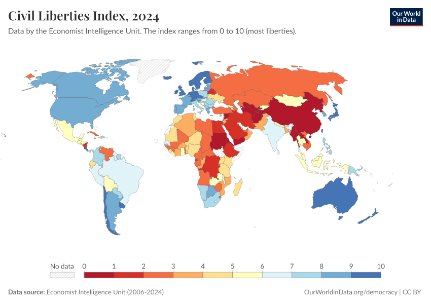 Economist Intelligence Unit (2006-2024) – processed by Our World in Data. “Civil Liberties Index” [dataset]. Economist Intelligence Unit, “Democracy Index 2021: The China challenge”; Economist Intelligence Unit, “Democracy Index 2022: Frontline democracy and the battle for Ukraine”; Economist Intelligence Unit, “Democracy Index 2023: Age of Conflict”; Economist Intelligence Unit, “Democracy Index 2024: What's wrong with representative democracy?”; Gapminder, “Democracy Index v4”; Various sources, “Population” [original data]. Retrieved March 12, 2026 from https://who-mortality-db.owid.pages.dev:8789/20260304-094028/grapher/civil-liberties-index-eiu.html (archived on March 4, 2026).