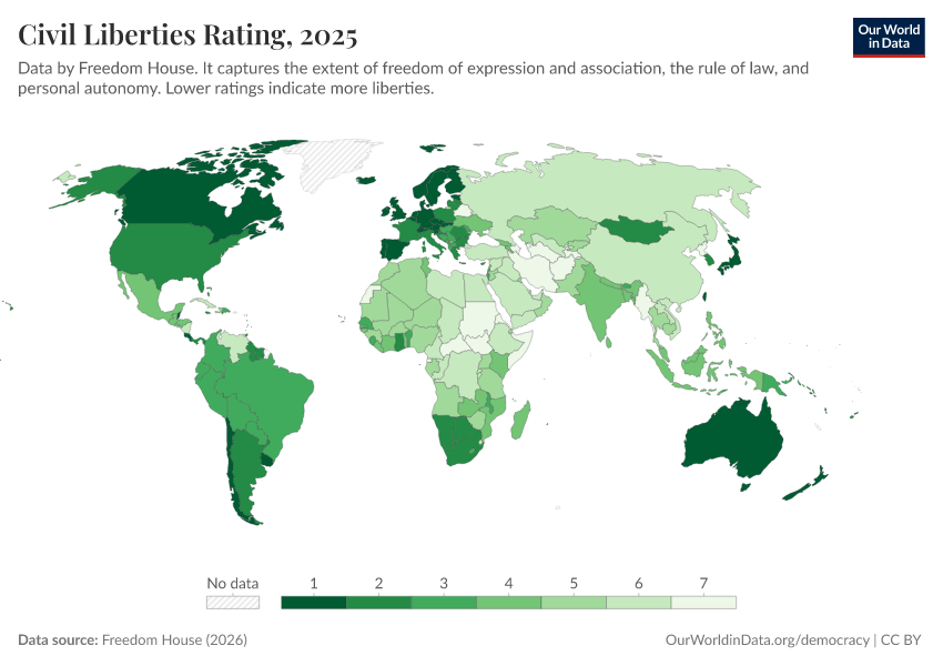 Freedom House (2025) – processed by Our World in Data. “Civil liberties rating” [dataset]. Freedom House, “Freedom in the World” [original data]. Retrieved March 12, 2026 from https://who-mortality-db.owid.pages.dev:8789/20260304-094028/grapher/civil-liberties-rating-fh.html (archived on March 4, 2026).