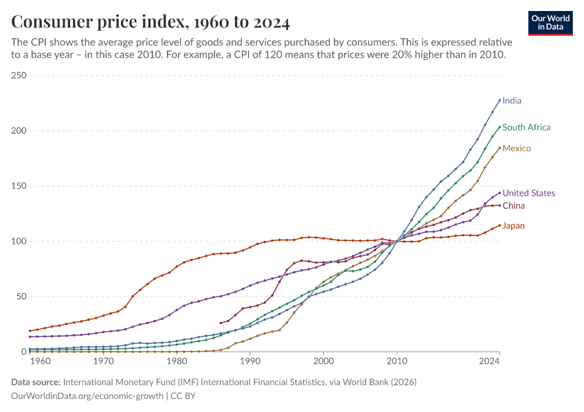 “Data Page: Consumer price index”. Our World in Data (2026). Data adapted from International Monetary Fund (IMF) International Financial Statistics, via World Bank. Retrieved from https://who-mortality-db.owid.pages.dev:8789/20260304-094028/grapher/consumer-price-index.html [online resource] (archived on March 4, 2026).How to cite this data