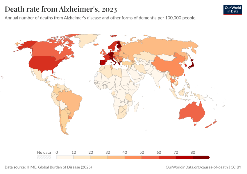 IHME, Global Burden of Disease (2025) – with major processing by Our World in Data. “Death rate from Alzheimer's” [dataset]. IHME, Global Burden of Disease, “Global Burden of Disease - Deaths” [original data]. Retrieved March 12, 2026 from https://who-mortality-db.owid.pages.dev:8789/20260304-094028/grapher/death-rate-from-alzheimers-other-dementias-gbd.html (archived on March 4, 2026).