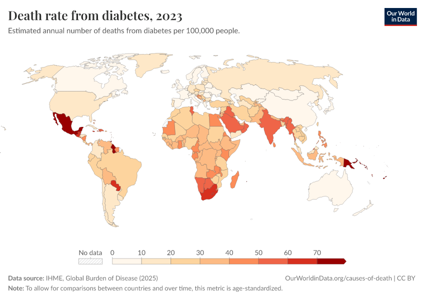 IHME, Global Burden of Disease (2025) – with major processing by Our World in Data. “Death rate from diabetes” [dataset]. IHME, Global Burden of Disease, “Global Burden of Disease - Deaths” [original data]. Retrieved March 12, 2026 from https://who-mortality-db.owid.pages.dev:8789/20260304-094028/grapher/death-rate-from-diabetes.html (archived on March 4, 2026).