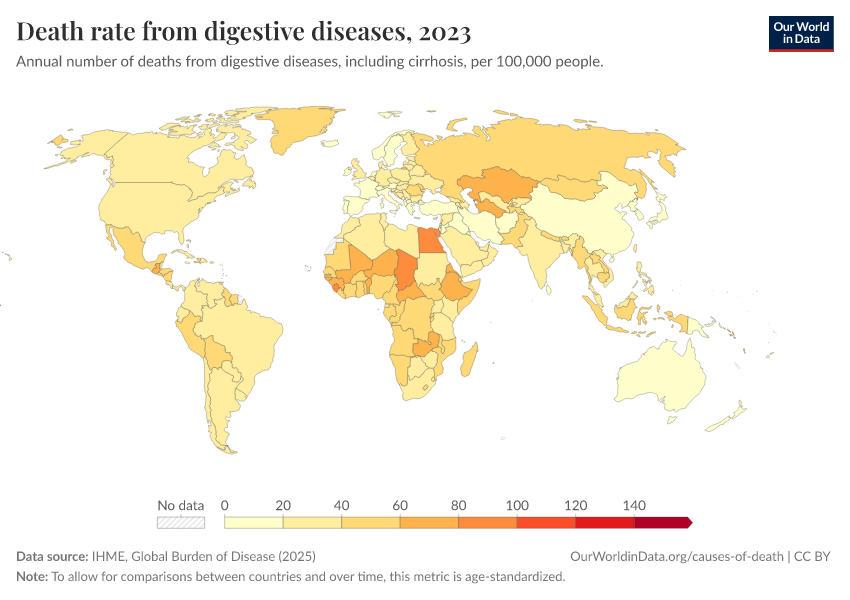 IHME, Global Burden of Disease (2025) – with major processing by Our World in Data. “Death rate from digestive diseases” [dataset]. IHME, Global Burden of Disease, “Global Burden of Disease - Deaths” [original data]. Retrieved March 12, 2026 from https://who-mortality-db.owid.pages.dev:8789/20260304-094028/grapher/death-rate-from-digestive-diseases.html (archived on March 4, 2026).