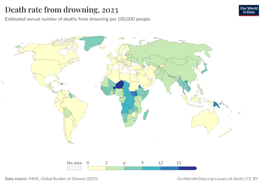 IHME, Global Burden of Disease (2025) – with major processing by Our World in Data. “Death rate from drowning” [dataset]. IHME, Global Burden of Disease, “Global Burden of Disease - Deaths” [original data]. Retrieved March 12, 2026 from https://who-mortality-db.owid.pages.dev:8789/20260304-094028/grapher/death-rate-from-drowning.html (archived on March 4, 2026).