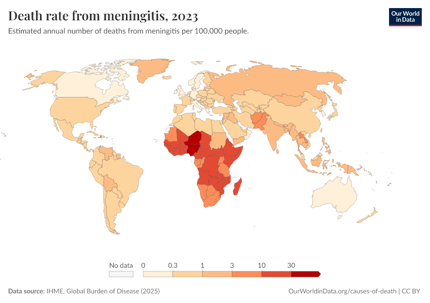 IHME, Global Burden of Disease (2025) – with major processing by Our World in Data. “Death rate from meningitis” [dataset]. IHME, Global Burden of Disease, “Global Burden of Disease - Deaths” [original data]. Retrieved March 12, 2026 from https://who-mortality-db.owid.pages.dev:8789/20260304-094028/grapher/death-rate-from-meningitis-gbd.html (archived on March 4, 2026).