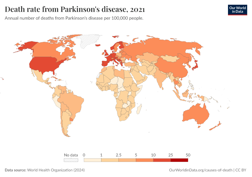 World Health Organization (2024) – with major processing by Our World in Data. “Death rate from Parkinson's disease” [dataset]. World Health Organization, “Global Health Estimates” [original data]. Retrieved March 12, 2026 from https://who-mortality-db.owid.pages.dev:8789/20260304-094028/grapher/death-rate-from-parkinsons-disease-ghe.html (archived on March 4, 2026).