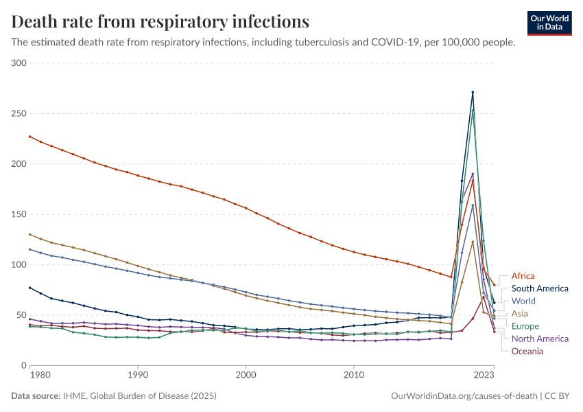 IHME, Global Burden of Disease (2025) – with major processing by Our World in Data. “Death rate from respiratory infections” [dataset]. IHME, Global Burden of Disease, “Global Burden of Disease - Deaths” [original data]. Retrieved March 12, 2026 from https://who-mortality-db.owid.pages.dev:8789/20260304-094028/grapher/death-rate-from-respiratory-infections-gbd.html (archived on March 4, 2026).