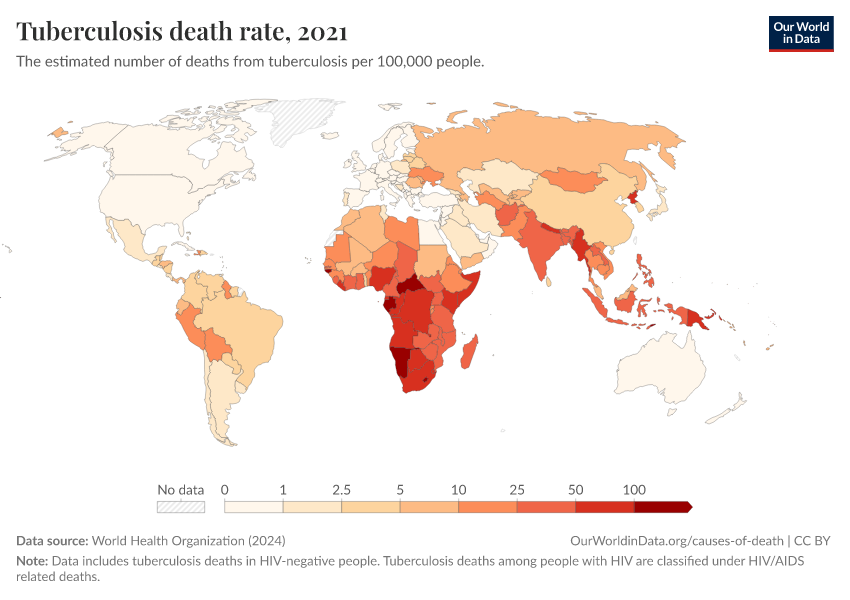 World Health Organization (2024) – with major processing by Our World in Data. “Tuberculosis death rate” [dataset]. World Health Organization, “Global Health Estimates” [original data]. Retrieved March 12, 2026 from https://who-mortality-db.owid.pages.dev:8789/20260304-094028/grapher/death-rate-from-tuberculosis-ghe.html (archived on March 4, 2026).