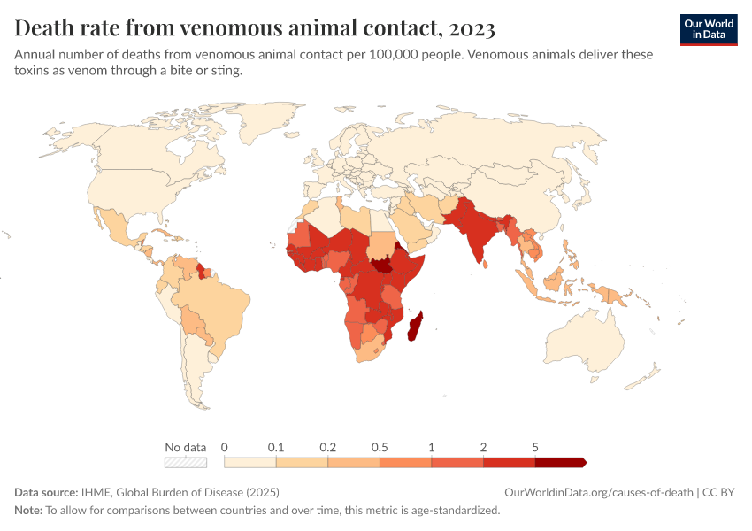 IHME, Global Burden of Disease (2025) – with major processing by Our World in Data. “Death rate from venomous animal contact” [dataset]. IHME, Global Burden of Disease, “Global Burden of Disease - Deaths” [original data]. Retrieved March 12, 2026 from https://who-mortality-db.owid.pages.dev:8789/20260304-094028/grapher/death-rate-from-venomous-animal.html (archived on March 4, 2026).