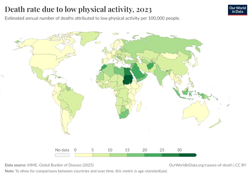 IHME, Global Burden of Disease (2025) – with major processing by Our World in Data. “Death rate due to low physical activity” [dataset]. IHME, Global Burden of Disease, “Global Burden of Disease - Risk Factors - Deaths” [original data]. Retrieved March 12, 2026 from https://who-mortality-db.owid.pages.dev:8789/20260304-094028/grapher/death-rates-due-to-low-physical-activity.html (archived on March 4, 2026).