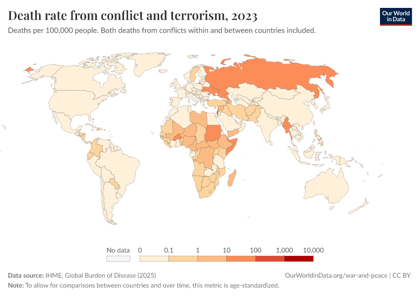 “Data Page: Death rate from conflict and terrorism”, part of the following publication: Esteban Ortiz-Ospina and Max Roser (2016) - “Global Health”. Data adapted from IHME, Global Burden of Disease. Retrieved from https://who-mortality-db.owid.pages.dev:8789/20260304-094028/grapher/death-rates-from-conflict-and-terrorism-gbd.html [online resource] (archived on March 4, 2026).How to cite this data