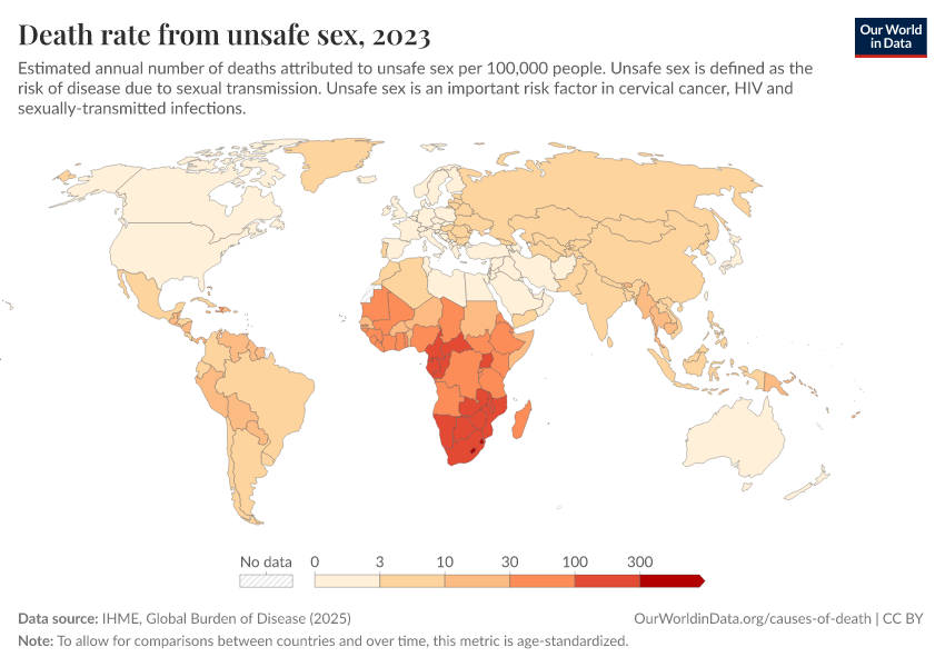 IHME, Global Burden of Disease (2025) – with major processing by Our World in Data. “Death rate from unsafe sex” [dataset]. IHME, Global Burden of Disease, “Global Burden of Disease - Risk Factors - Deaths” [original data]. Retrieved March 12, 2026 from https://who-mortality-db.owid.pages.dev:8789/20260304-094028/grapher/death-rates-from-unsafe-sex.html (archived on March 4, 2026).