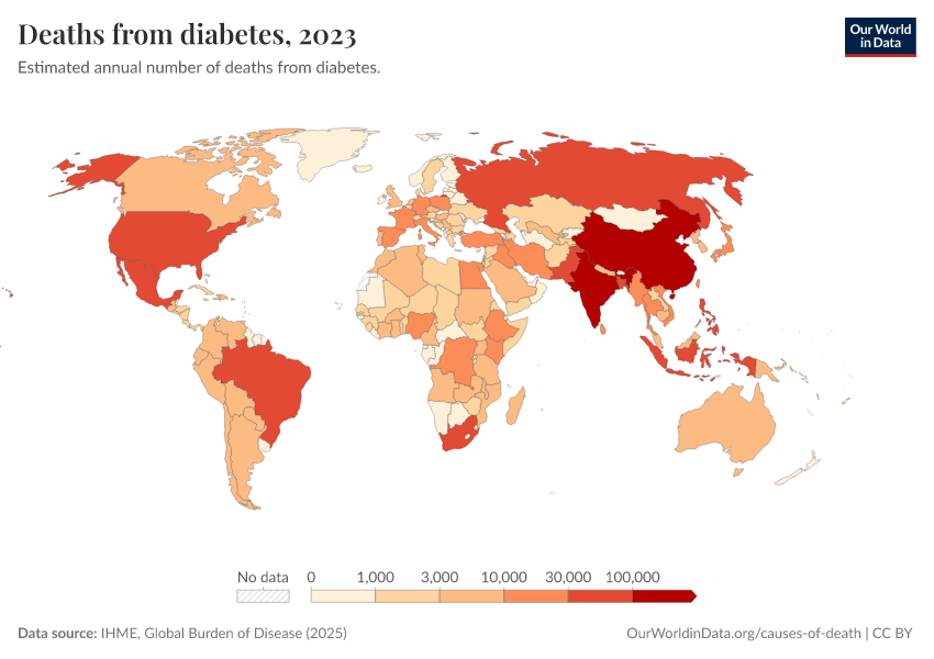 IHME, Global Burden of Disease (2025) – with major processing by Our World in Data. “Deaths from diabetes” [dataset]. IHME, Global Burden of Disease, “Global Burden of Disease - Deaths” [original data]. Retrieved March 12, 2026 from https://who-mortality-db.owid.pages.dev:8789/20260304-094028/grapher/deaths-from-diabetes.html (archived on March 4, 2026).