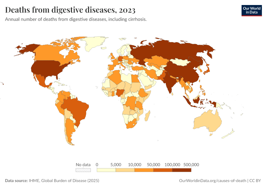 IHME, Global Burden of Disease (2025) – with major processing by Our World in Data. “Deaths from digestive diseases” [dataset]. IHME, Global Burden of Disease, “Global Burden of Disease - Deaths” [original data]. Retrieved March 12, 2026 from https://who-mortality-db.owid.pages.dev:8789/20260304-094028/grapher/deaths-from-digestive-diseases.html (archived on March 4, 2026).