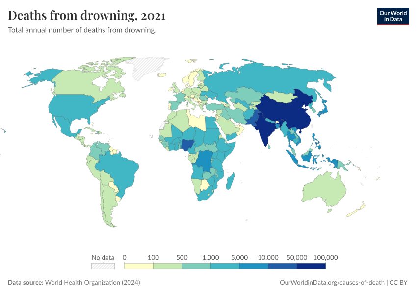 World Health Organization (2024) – with major processing by Our World in Data. “Deaths from drowning” [dataset]. World Health Organization, “Global Health Estimates” [original data]. Retrieved March 12, 2026 from https://who-mortality-db.owid.pages.dev:8789/20260304-094028/grapher/deaths-from-drowning-ghe.html (archived on March 4, 2026).