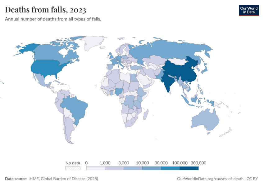 “Data Page: Deaths from falls”, part of the following publication: Esteban Ortiz-Ospina and Max Roser (2016) - “Global Health”. Data adapted from IHME, Global Burden of Disease. Retrieved from https://who-mortality-db.owid.pages.dev:8789/20260304-094028/grapher/deaths-from-falls-gbd.html [online resource] (archived on March 4, 2026).How to cite this data