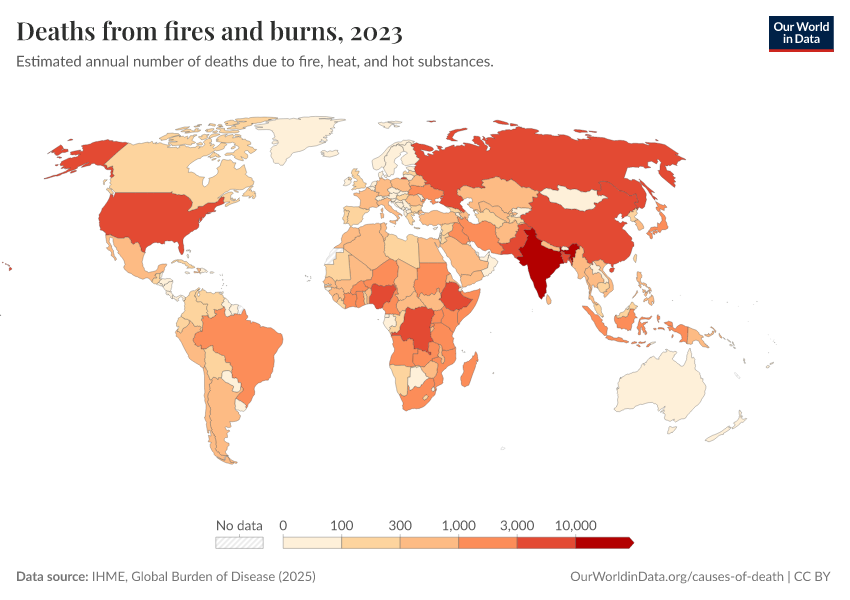 IHME, Global Burden of Disease (2025) – with major processing by Our World in Data. “Deaths from fires and burns” [dataset]. IHME, Global Burden of Disease, “Global Burden of Disease - Deaths” [original data]. Retrieved March 12, 2026 from https://who-mortality-db.owid.pages.dev:8789/20260304-094028/grapher/deaths-from-fires-and-burns.html (archived on March 4, 2026).