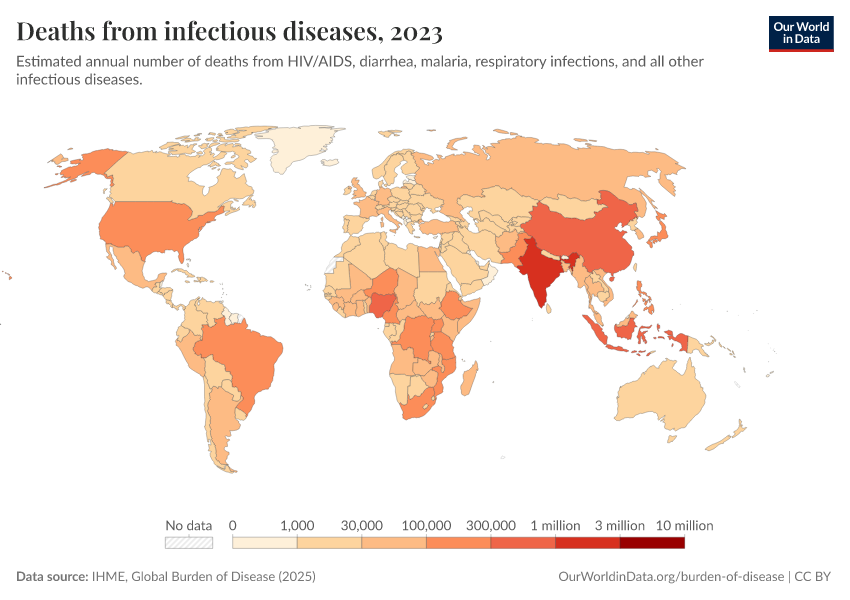 IHME, Global Burden of Disease (2025) – with major processing by Our World in Data. “Deaths from infectious diseases” [dataset]. IHME, Global Burden of Disease, “Global Burden of Disease - Deaths” [original data]. Retrieved March 12, 2026 from https://who-mortality-db.owid.pages.dev:8789/20260304-094028/grapher/deaths-from-infectious-diseases.html (archived on March 4, 2026).