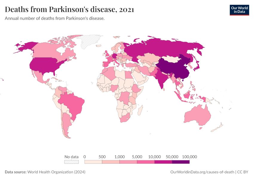 “Data Page: Deaths from Parkinson's disease”, part of the following publication: Esteban Ortiz-Ospina and Max Roser (2016) - “Global Health”. Data adapted from World Health Organization. Retrieved from https://who-mortality-db.owid.pages.dev:8789/20260304-094028/grapher/deaths-from-parkinsons-disease-ghe.html [online resource] (archived on March 4, 2026).How to cite this data
