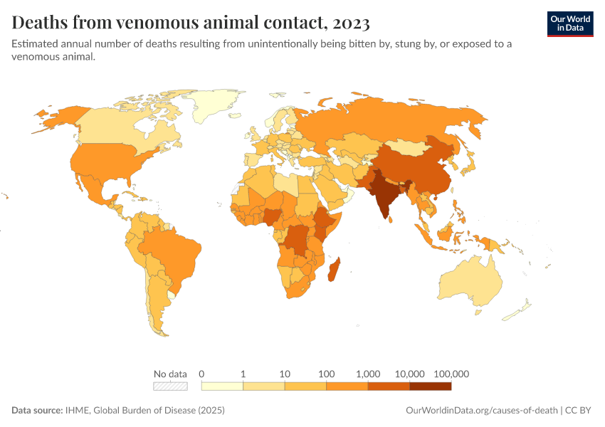 IHME, Global Burden of Disease (2025) – with major processing by Our World in Data. “Deaths from venomous animal contact” [dataset]. IHME, Global Burden of Disease, “Global Burden of Disease - Deaths” [original data]. Retrieved March 12, 2026 from https://who-mortality-db.owid.pages.dev:8789/20260304-094028/grapher/deaths-from-venomous-animal-contact.html (archived on March 4, 2026).