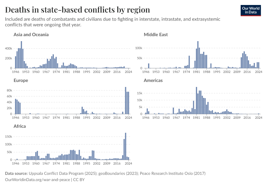 “Data Page: Deaths in state-based conflicts by region”, part of the following publication: Bastian Herre, Lucas Rodés-Guirao, and Max Roser (2024) - “War and Peace”. Data adapted from Uppsala Conflict Data Program, geoBoundaries, Peace Research Institute Oslo. Retrieved from https://who-mortality-db.owid.pages.dev:8789/20260304-094028/grapher/deaths-in-state-based-conflicts-by-region.html [online resource] (archived on March 4, 2026).How to cite this data