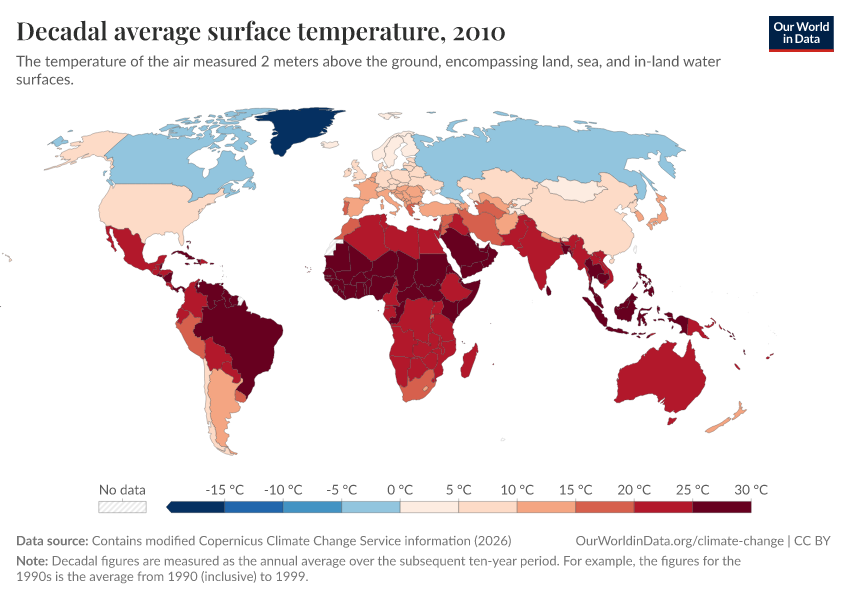 “Data Page: Decadal average surface temperature”, part of the following publication: Hannah Ritchie, Pablo Rosado, and Veronika Samborska (2024) - “Climate Change”. Data adapted from Contains modified Copernicus Climate Change Service information. Retrieved from https://who-mortality-db.owid.pages.dev:8789/20260309-085120/grapher/decadal-average-surface-temperature.html [online resource] (archived on March 9, 2026).How to cite this data