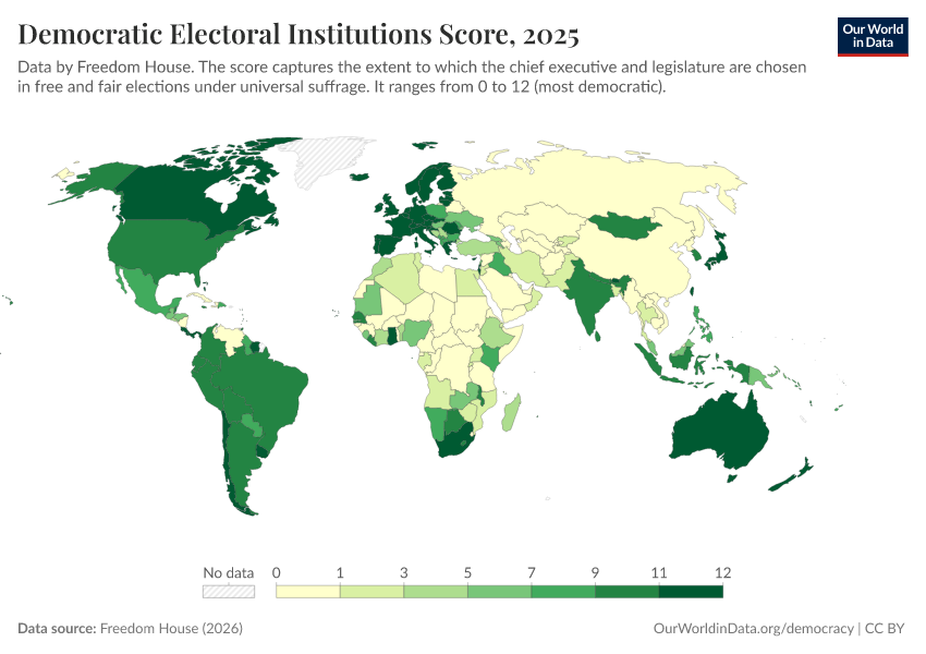 Freedom House (2025) – processed by Our World in Data. “Democratic Electoral Institutions Score” [dataset]. Freedom House, “Freedom in the World” [original data]. Retrieved March 12, 2026 from https://who-mortality-db.owid.pages.dev:8789/20260304-094028/grapher/democratic-electoral-institutions-fh.html (archived on March 4, 2026).