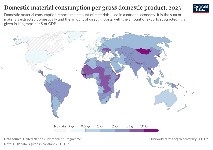 “Data Page: Domestic material consumption per gross domestic product”. Our World in Data (2026). Data adapted from United Nations Environment Programme. Retrieved from https://who-mortality-db.owid.pages.dev:8789/20260304-094028/grapher/domestic-material-consumption-per-unit-of-gdp.html [online resource] (archived on March 4, 2026).How to cite this data