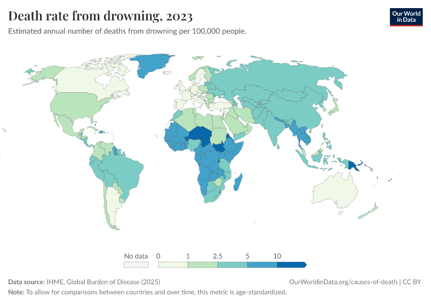 IHME, Global Burden of Disease (2025) – with major processing by Our World in Data. “Death rate from drowning” [dataset]. IHME, Global Burden of Disease, “Global Burden of Disease - Deaths” [original data]. Retrieved March 12, 2026 from https://who-mortality-db.owid.pages.dev:8789/20260304-094028/grapher/drowning-death-rates.html (archived on March 4, 2026).