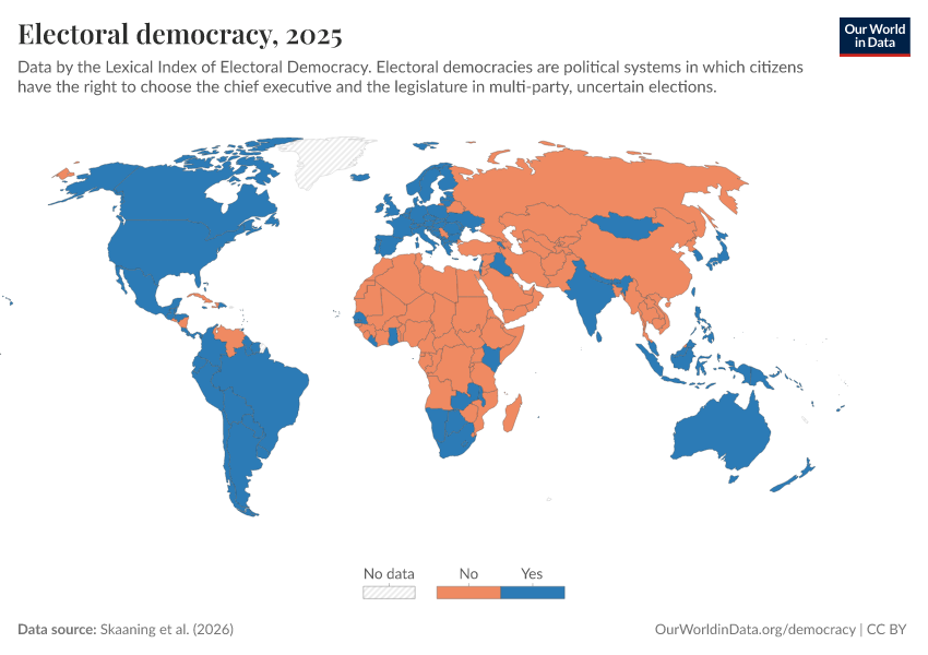 Skaaning et al. (2025) – processed by Our World in Data. “Electoral democracy” [dataset]. Skaaning et al., “Lexical Index of Electoral Democracy (LIED) v6.8” [original data]. Retrieved March 12, 2026 from https://who-mortality-db.owid.pages.dev:8789/20260304-094028/grapher/electoral-democracy-lexical.html (archived on March 4, 2026).